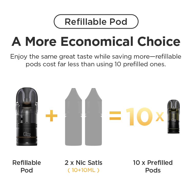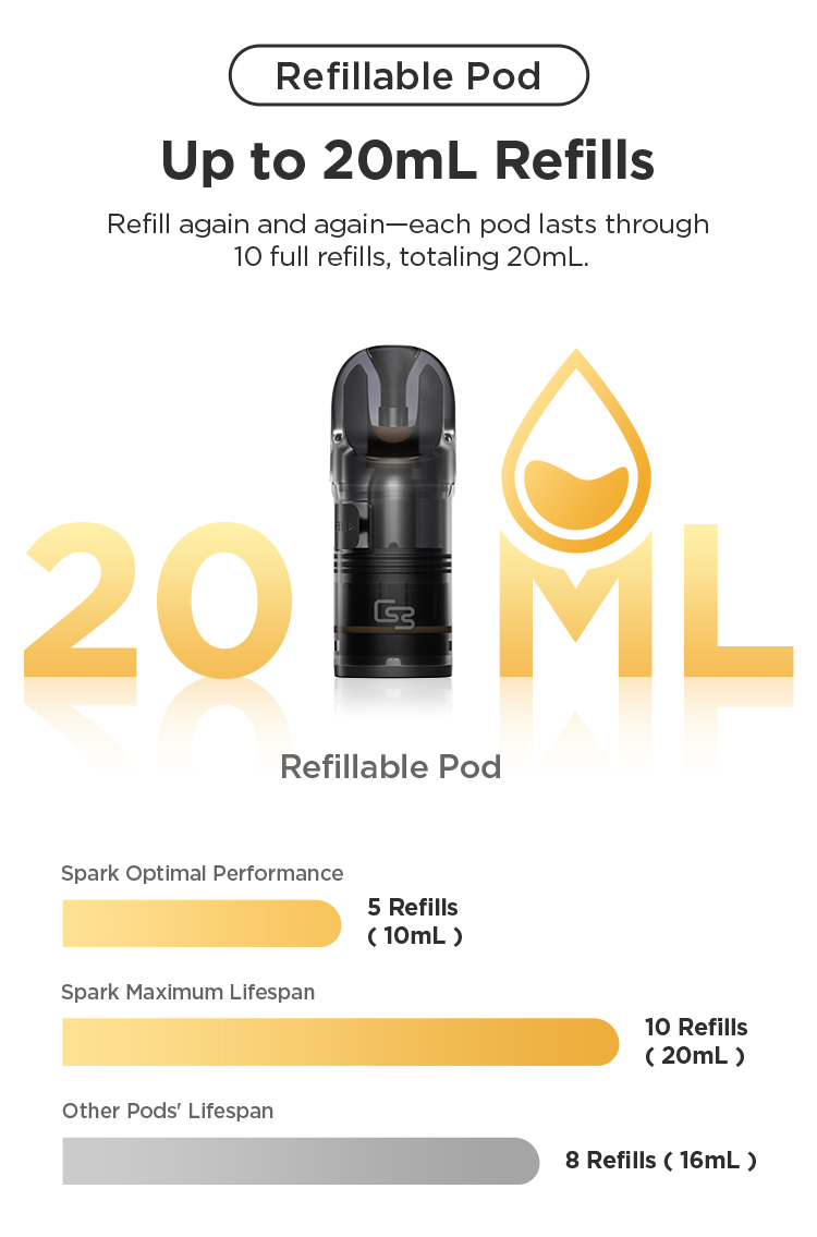 Refill again and again—each pod lasts through 10 full refills, totaling 20mL.